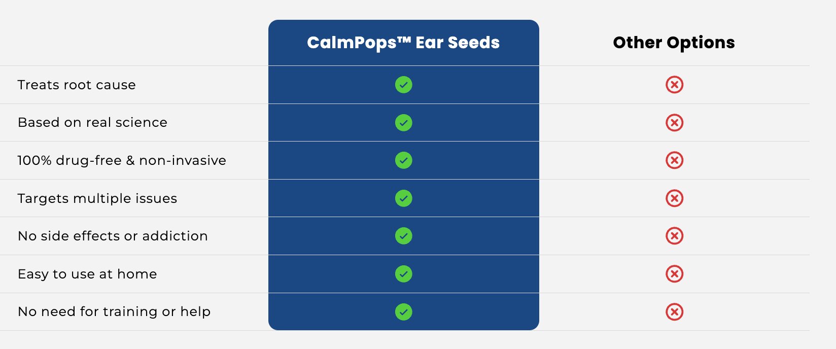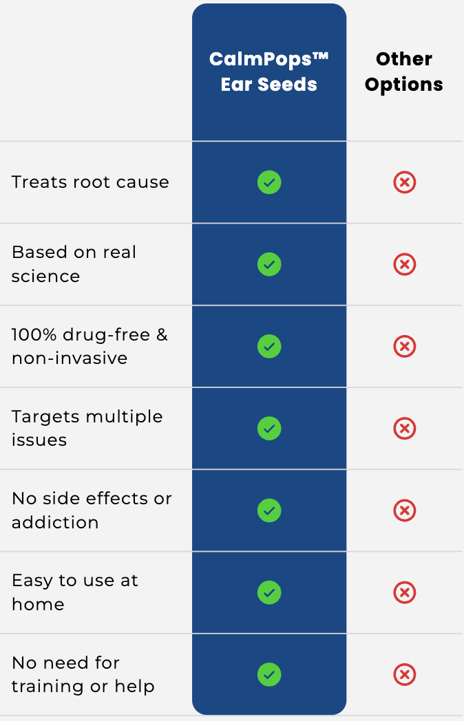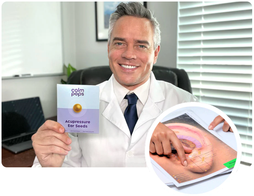 Instead of needles, CalmPops use tiny ear seeds to activate points on your ear that interact with key systems throughout the body.